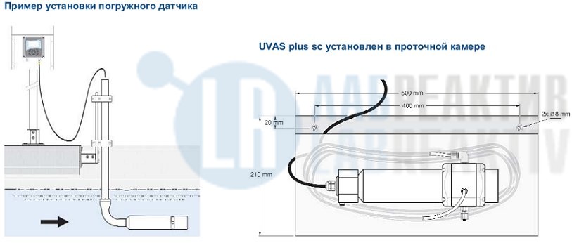 UVAS plus sc погружается непосредственно в анализируемую среду, без предварительной пробоподготовки образца датчик измеряет содержание растворенных органических веществ в аэротенках с активным илом на муниципальных станция очистки сточных вод, в поверхностной природной воде, в неподготовленной и в подготовленной питьевой воде. Данная система так же может использоваться для контроля качества выходной воды из очистных сооружений.
