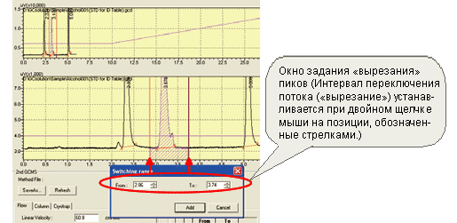 Одной из важнейших особенностей программного обеспечения MDGCsolution является установка условий переключения потока при просмотре хроматограммы. Для выбора интервала «вырезания» просто наведите курсор к необходимому пику и щелкните по нему мышкой; интервал «вырезания» устанавливается с шагом 0,01 минута. Так как операция достаточно проста, вам не потребуется большое количество времени для установки условий «вырезания» нескольких пиков или создании нескольких методов с различными временами вырезания.
