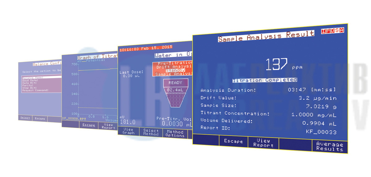 На большом и цветном ЖК экране отображаются выбранный метод титрования, результаты, единицы измерения, дозируемая навеска, объём титрования, скоростью дрейфа и значением мВ.