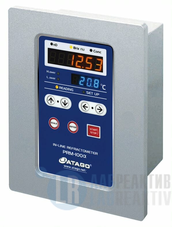 Промышленный рефрактометр PRM-100 alpha DX является самым передовым промышленным рефрактометром ATAGO и предназначен для измерения концентрации веществ в потоке непрерывным способом. Прибор состоит из двух блоков. Первый — сам измерительный блок, который монтируется в трубу или бак при помощи специальных креплений (см. опции). Второй — блок отображения информации. Соединяются два блока кабелем длиной 15 метров или более. Призма измерительного блока выполнена из высококачественного искусственного сапфира и обладает стойкостью к механическим повреждениям и налипанию образца. Прибор имеет высокую точность измерения в широком диапазоне, две шкалы измерений (Brix или nD), а также многочисленные функции, упрощающие опознавание сбоя в концентрации образца. Имеет три выхода — выход RS-232C, аналоговый выход 4-20 мА и выход для сигнализации. Измерительная часть прибора выдерживает тепловые нагрузки в диапазоне 5.0 до 150.0˚C и давление до 10 атм. Функция АТК работает в диапазоне от 5 до 100˚C.
