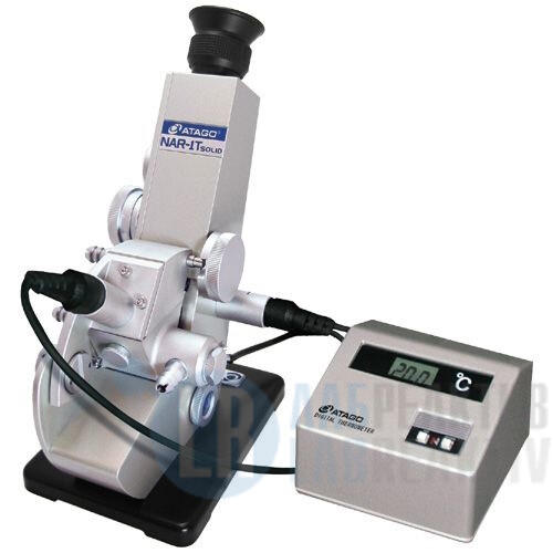 Модель NAR-1T Solid предназначена для измерения показателя преломления как жидких, так и твердых образцов, таких как пленки или стекло. Может комплектоваться внешней водяной баней — циркулятором. Рефрактометр оснащен цифровым блоком, который отображает температуру призмы.