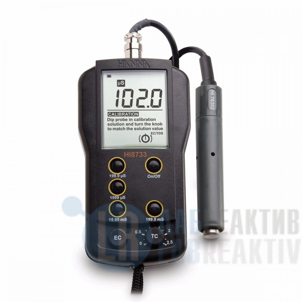 Портативный HI 8733 измеритель электрической проводимости может использоваться в различных областях. В приборе предусмотрено четыре диапазона измерений от 0,0 мкСм/см до 199,9 мСм/см с точностью ± 1% полной шкалы измерений. Входящий в комплект прибора четырёхэлектродный датчик проводимости HI76302W позволяет проводить измерения в широком диапазоне концентраций с помощью одного датчика. При этом, четырёхэлектродная технология устраняет эффект поляризации, являющейся общей проблемой стандартных датчиков с двумя электродами-полюсами. Кроме того, для обеспечения автоматической температурной компенсации в диапазоне от 0 до 50°C (от 32 до 122°F) с регулируемой величиной β в пределах от 0 до 2,5%/°C, в датчик измерения проводимости встроен датчик измерения температуры.