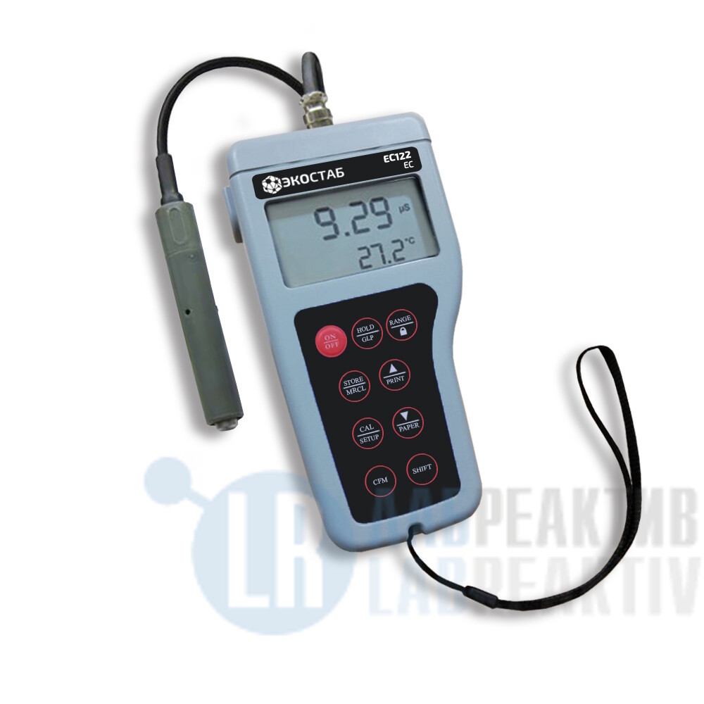 EC122 — портативный влагозащищенный прибор, предназначенный для работы в сложных условиях. Прибор измеряет проводимость в 5 диапазонах, автоматически переключая диапазон измерения и разрешение в зависимости от измеряемого значения, выбирая шкалу с самым высоким разрешением. Температурная компенсация может быть выполнена в автоматическом режиме (ATC) или вручную (MTC). Функцию температурной компенсации можно отключить для измерения фактической проводимости. Модель оснащена индикатором стабильности измерений, имеет возможность просматривать данные в соответствии с GLP (надлежащей лабораторной практикой) и выбора персонального идентификационного кода (IDcode).