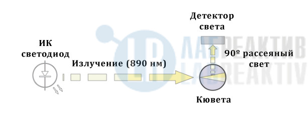 Пучок света, проходящий через образец, рассеивается во всех направлениях. На интенсивность и характер рассеянного света влияет множество факторов, таких как длина волны падающего света, размер и форма частиц, коэффициент преломления и цвет. Оптическая система HI98713 состоит из ИК светодиода, приемника рассеянного света (под углом 90°) и детектора проходящего света (180°). Какой из детекторов используется зависит от режима измерения.