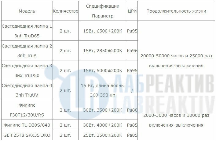 - 7 источников света, 4 комплекта светодиодов (срок службы до 25000 раз), 3 комплекта люминесцентных источников света.