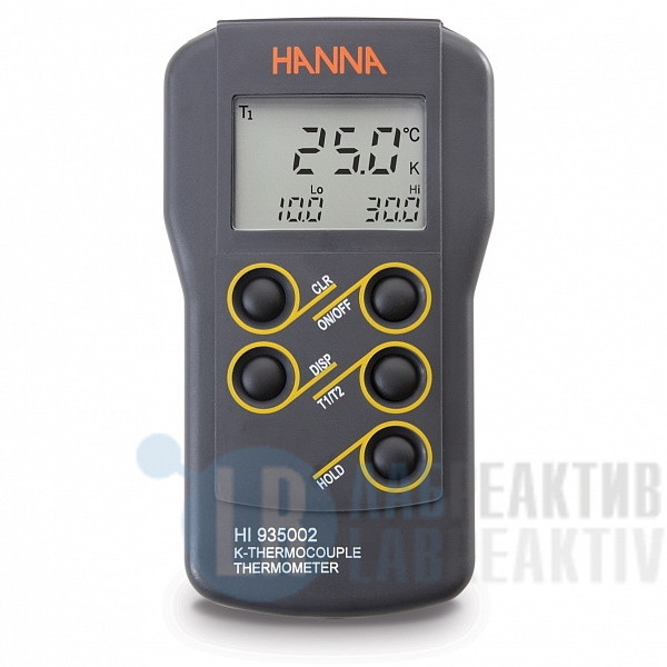 HI 935002 2-х канальный водонепроницаемый термометр, работающий в широком температурном диапазоне. Батарея расчитана на 1600 часов работы прибора в лабораторных или полевых условиях. Прибор оснащен двух уровневым ЖК монитором, который отображает текущую температуру одновременно с минимальной и максимальной температурами серии измерений. На экран также можно выводить разницу показания двух каналов. Прибор позволяет в режиме реального времени видеть изменения показаний в двух каналах. Чтобы остановить измерения — нажмите кнопку HOLD и HI 935002 сохранит последнее значение. Прибор может настраиваться для отображения температуры в °C или °F с помощью кнопки °C/°F. При длительном бесперебойном использовании система контроля батареи предупредит о разрядке.