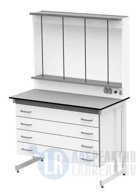 - 2 полки глубиной 230 мм, изготовлены из стали, окрашенной порошковой краской темно-серого цвета (RAL 7011). Нижняя полка расположена на высоте 150 мм от уровня столешницы