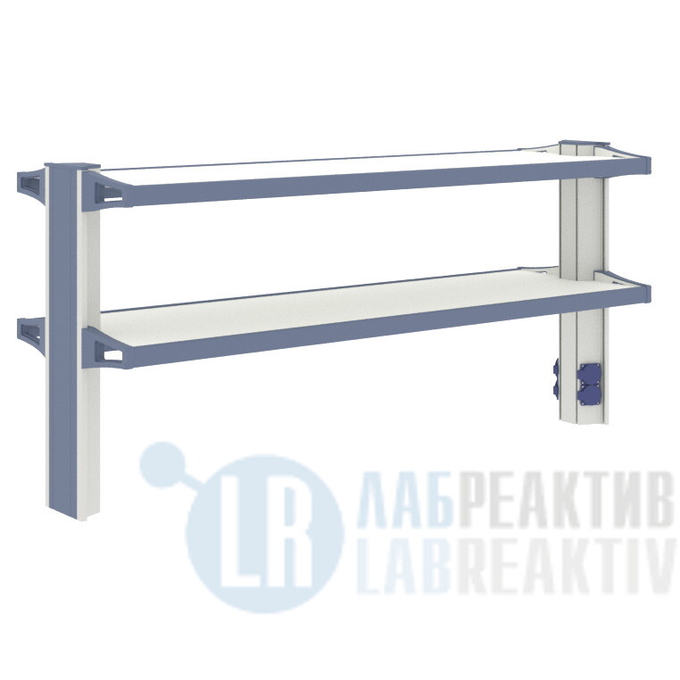 — 2 полки глубиной 400мм – ПВХ толщиной 5мм в рамке из двух алюминиевых профилей, окрашенных порошковой краской (RAL 5023), полки устанавливаются на необходимой высоте, предусмотрена возможность изменения положения полок по высоте стеллажа с помощью быстрозажимных элементов