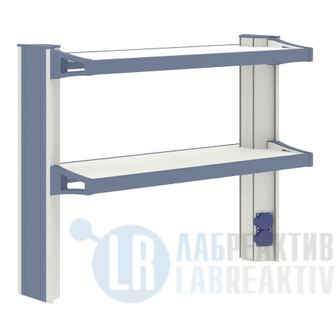 — 2 полки глубиной 400 мм – ПВХ толщиной 5 мм в рамке из двух алюминиевых профилей, окрашенных порошковой краской (RAL 5023), полки устанавливаются на необходимой высоте, предусмотрена возможность изменения положения полок по высоте стеллажа с помощью быстрозажимных элементов
