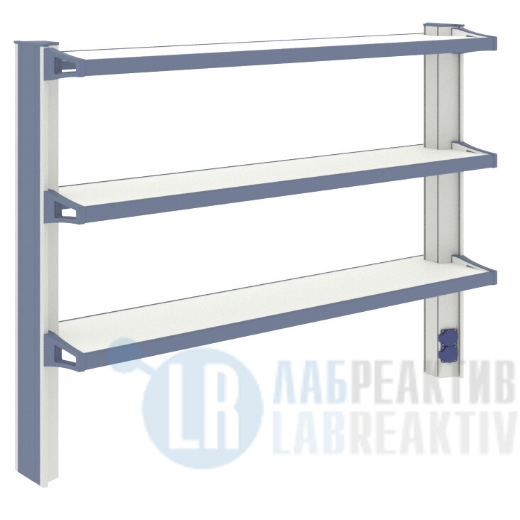 — 3 полки глубиной 400 мм – ПВХ толщиной 5 мм в рамке из двух алюминиевых профилей, окрашенных порошковой краской (RAL 5023), полки устанавливаются на необходимой высоте, предусмотрена возможность изменения положения полок по высоте стеллажа с помощью быстрозажимных элементов