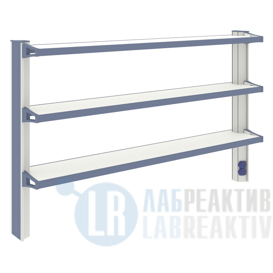 — 3 полки глубиной 400 мм – ПВХ толщиной 5 мм в рамке из двух алюминиевых профилей, окрашенных порошковой краской (RAL 5023), полки устанавливаются на необходимой высоте, предусмотрена возможность изменения положения полок по высоте стеллажа с помощью быстрозажимных элементов