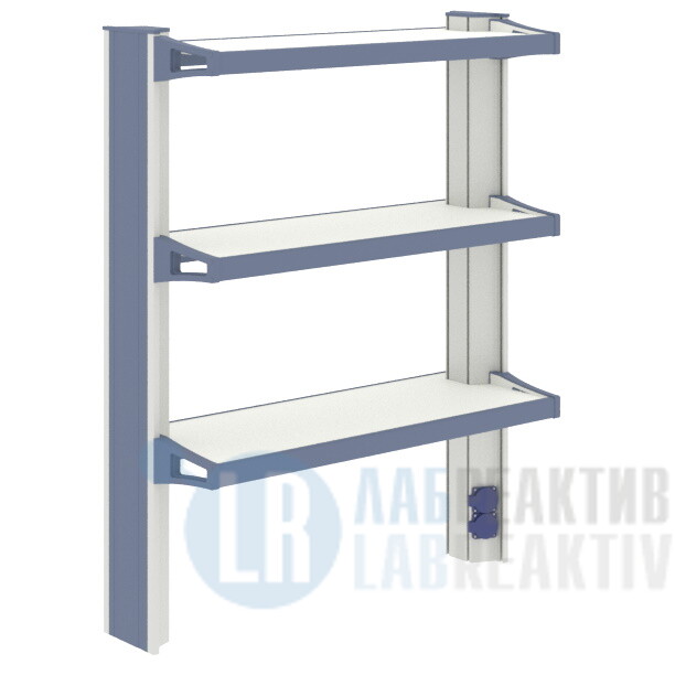 — 3 полки глубиной 400 мм – ПВХ толщиной 5 мм в рамке из двух алюминиевых профилей, окрашенных порошковой краской (RAL 5023), полки устанавливаются на необходимой высоте, предусмотрена возможность изменения положения полок по высоте стеллажа с помощью быстрозажимных элементов