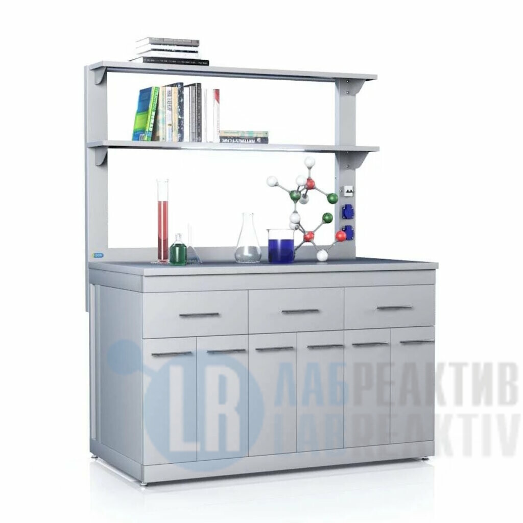 Стол имеет отделения для хранения посуды и инструментов. По требованию заказчика расположение полок и тумб в столе может быть изменено, также при необходимости можно встроить мойку и другое лабораторное оборудование.