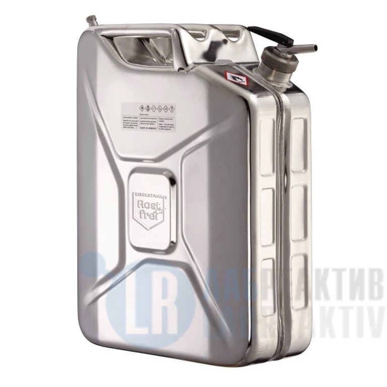 Защитные канистры из нержавеющей стали для розлива, хранения и транспортировки горючих жидкостей: нержавеющая сталь 1.4571 в случае с канистрами на 5 и 10 л, 1.4301 в случае с канистрами на 20 л.