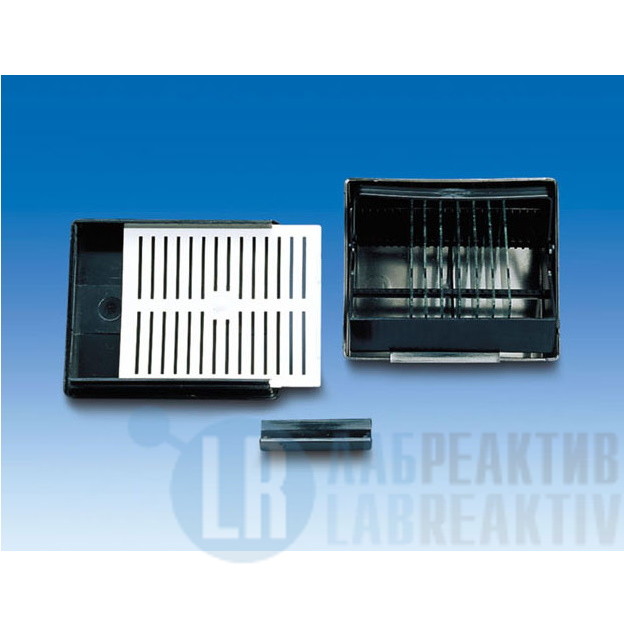 Состоит из контейнера для окрашивания и штатива на 25 предметных стекол размером 76×26 мм.