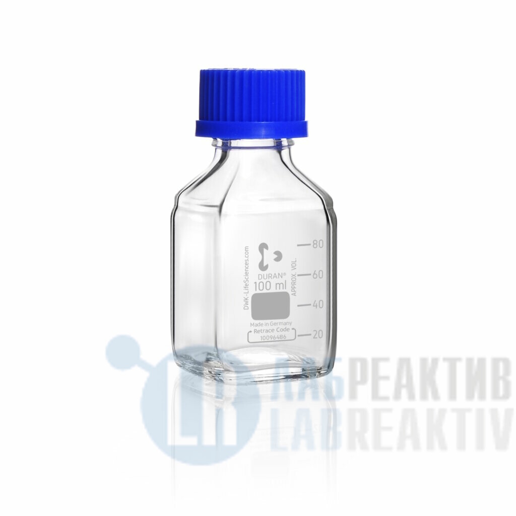 Бутыль DURAN® Square 100 мл, GL32, квадратная, с крышкой и сливным кольцом, бесцветное стекло