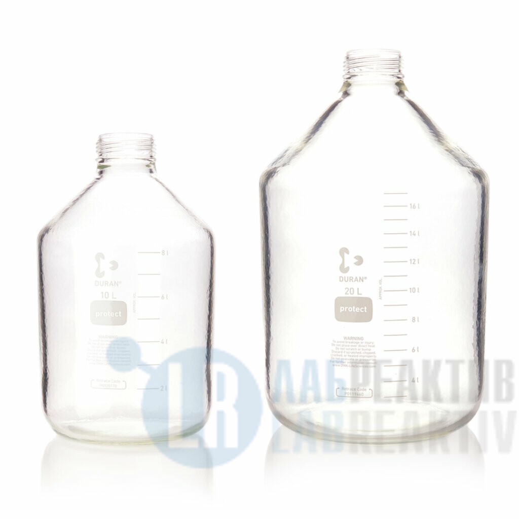 Эти бутыли большого размера идеально подходят для бестарного хранения и обработки как жидких, так и твердых промежуточных продуктов и готовых составов. Изготовлен из боросиликатного стекла 3.3 типа 1, что обеспечивает долговечность и устойчивость к тепловым нагрузкам. Стекло соответствует американским (USP), европейским (EP) и японским стандартам фармакопеи (JP), что делает бутыли идеальными для фармацевтического производства. Изготовлены с утолщенными однородными боковыми стенками для повышения механической прочности. Изготовлены из неорганических материалов (сертифицировано на отсутствие BSE / TSE). Подходят для высокотемпературной стерилизации, депирогенизации или автоклавирования. Имеют большие, стойкие, легко читаемые градуировки из белой эмали. Внешнее полиуретановое защитное покрытие для повышенной устойчивости к царапинам. Доступны с индивидуальными логотипами, идентификационной маркировкой или градуировкой. Поставляются без резьбовой крышки или сливного кольца, но могут использоваться в сочетании с крышками и соединительными системами. Типичные области применения: Плоское прочное основание идеально подходит для процессов смешивания с большими магнитными мешалками.