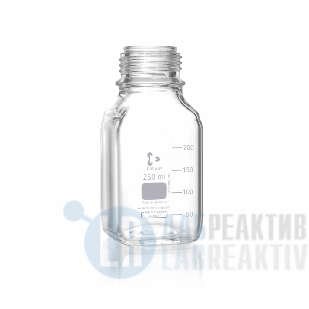 Лабораторная бутылка квадратной формы DURAN Group прозрачная, без завинчивающейся крышки и кольца для заливки, 250 мл, GL 45
