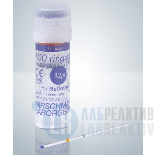 Одноразовые капиллярные пипетки ringcaps® для Reflotron®, с кольцевой меткой на 32 мкл, гепаринизированные литием, DURAN®, сертификат соответствия, с номером партии на упаковке, с маркировкой: пригодны к использованию до, CE в соответствии с IVD 98/79 EC.