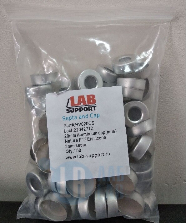 Алюминиевая крышка 20 мм с отверстием 10 мм Lab-Support 3 мм натур. PTFE/натуральный силикон септа, 100 шт./упаковка