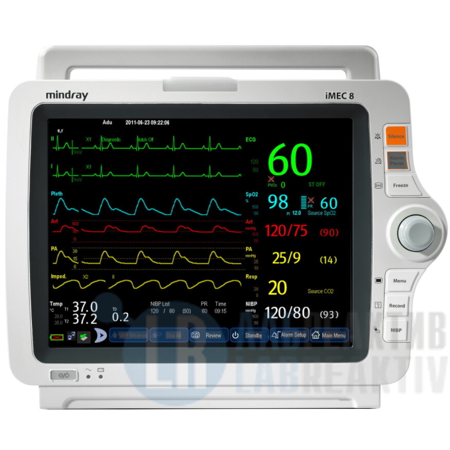 Mindray iMec 8 — современный монитор пациента, ставший по праву называться стандартом качества в своей среде. Обладает небольшими габаритами, что позволяет врачам свободно транспортировать его. Дисплей составляет 8 дюймов, что вполне достаточно для отображения всех необходимых параметров. Потребляет достаточно низкое количество энергии по сравнению со своими конкурентами на рынке оборудования.