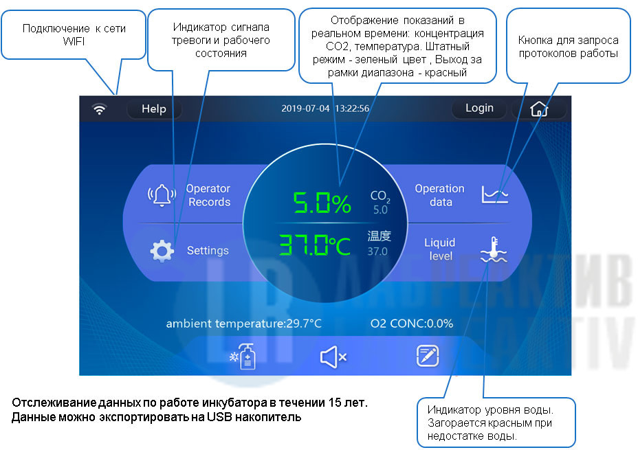 Современная панель управления оснащена сенсорным дисплеем. На дисплее отображаются текущие параметры работы, имеются индикаторы работы инкубатора и отображение сигналов тревоги в случае выхода за рамки заданных режимов. Внутренняя память позволяет сохранять протоколы работы инкубатора в течении 15 лет. Данные можно экспортировать на USB накопитель.