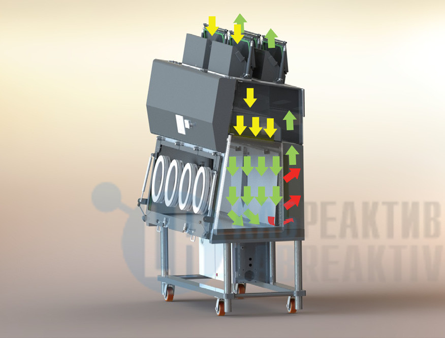 На входе рабочей камеры установлен фильтр F6, панельный воздушный фильтр, материал – стекловолокно. На входе в рабочую камеру – одинарный U15 ULPA фильтр. Одинарный H14 HEPA фильтр является фильтром возвратного контура. В качестве фильтра на сброс используется фильтр F6 (в стандартной комплектации), доступна установка H14 HEPA фильтра.