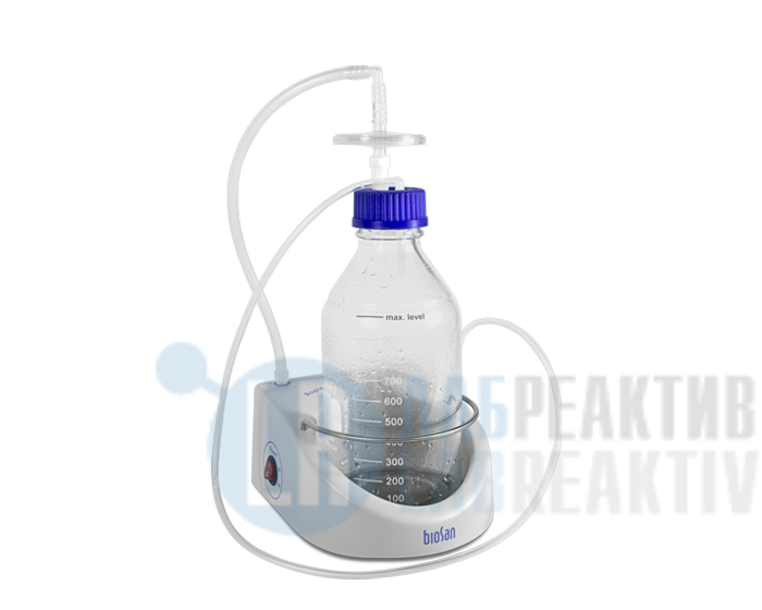Прибор также может быть использован для рутинных операций отмывания клеток от питательной среды и ресуспендирования в буфере. Принцип работы аспиратора заключается в создании отрицательного давления в колбе‐ловушке при помощи микрокомпрессора, встроенного в корпус. Колба-ловушка соединена полиэтиленовой трубкой с наконечником. Жидкость удаляется из пробирки в колбу-ловушку при соприкосновении наконечника с поверхностью раствора. Для удобства с правой стороны прибора находится мини‐штатив-органайзер, предназначенный для двух пробирок (например, раствора соляной кислоты и дистиллята), необходимых для отмывки и хранения наконечника с целью его повторного использования.