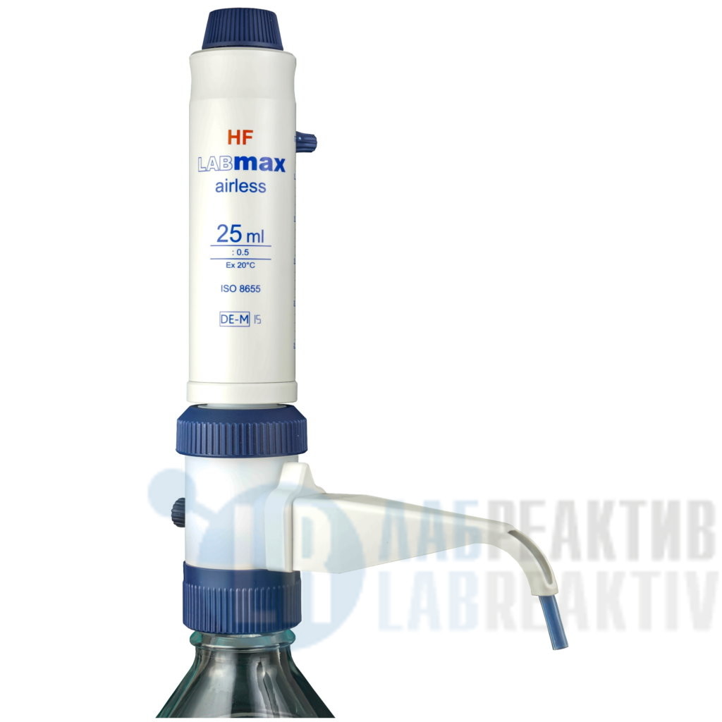 LABMAX airless HF — специальный дозатор для фтористоводородной кислоты (HF). Компоненты, которые имеют непосредственный контакт с кислотой, выполнены из HF-стойких материалов. LABMAX airless HF оснащен системой автоматической продувки воздуха: Ваш дозатор готов к использованию не более чем после двух дозировок.
