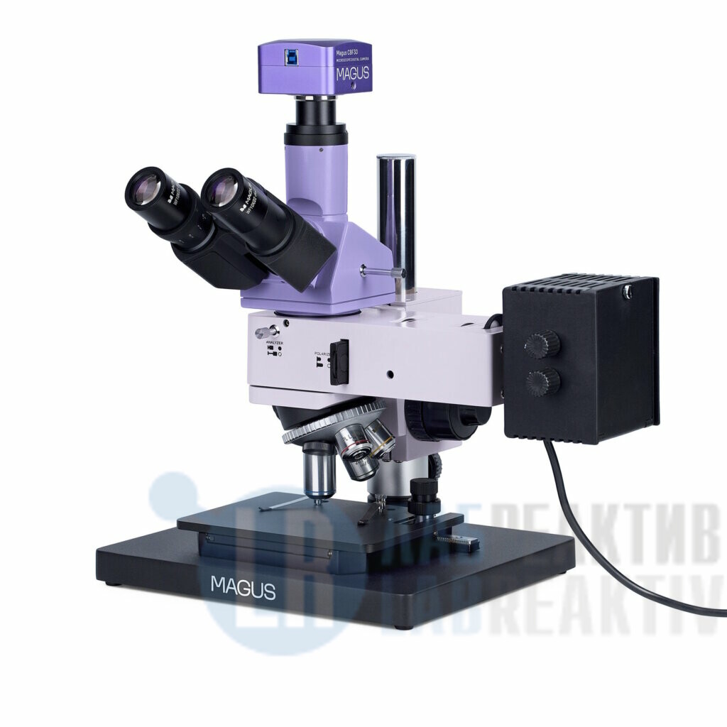 С камерой. Увеличение: 50–500х. Компактный штатив, тринокулярная визуальная насадка, объективы-планахроматы, галогенный осветитель отраженного света 30 Вт.
