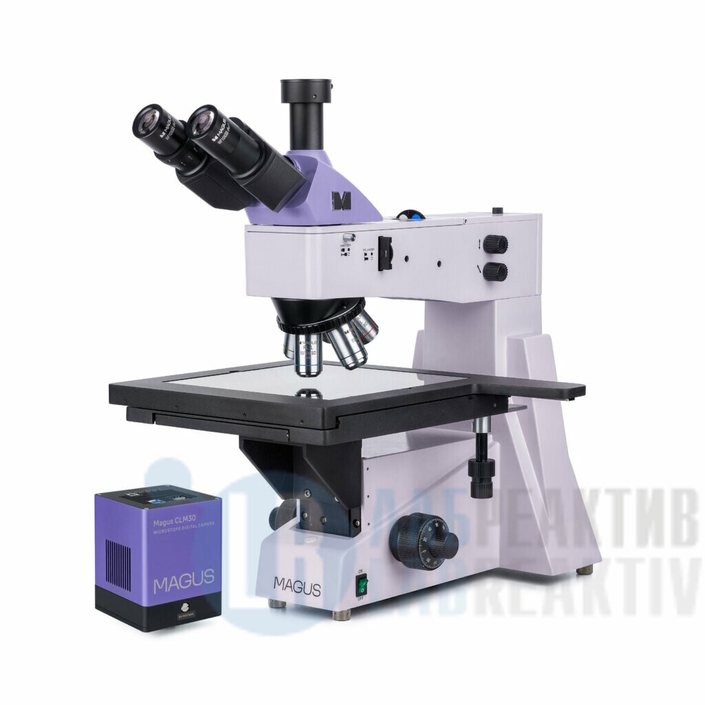 С камерой. Увеличение: 50–800х. Тринокулярная визуальная насадка, объективы-планахроматы для светлого и темного поля, галогенный осветитель отраженного света 50 Вт, тонкая фокусировка с шагом 0,7 мкм, большой предметный столик.
