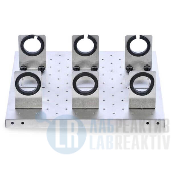 Захваты для колб изготавливаются из нержавеющей стали или ПВХ. Все платформы изготовлены из нержавеющей стали. Резиновые коврики прилагаются к платформам для выращивания бактерий, платформам регулируемого размера и держателям для больших сосудов.