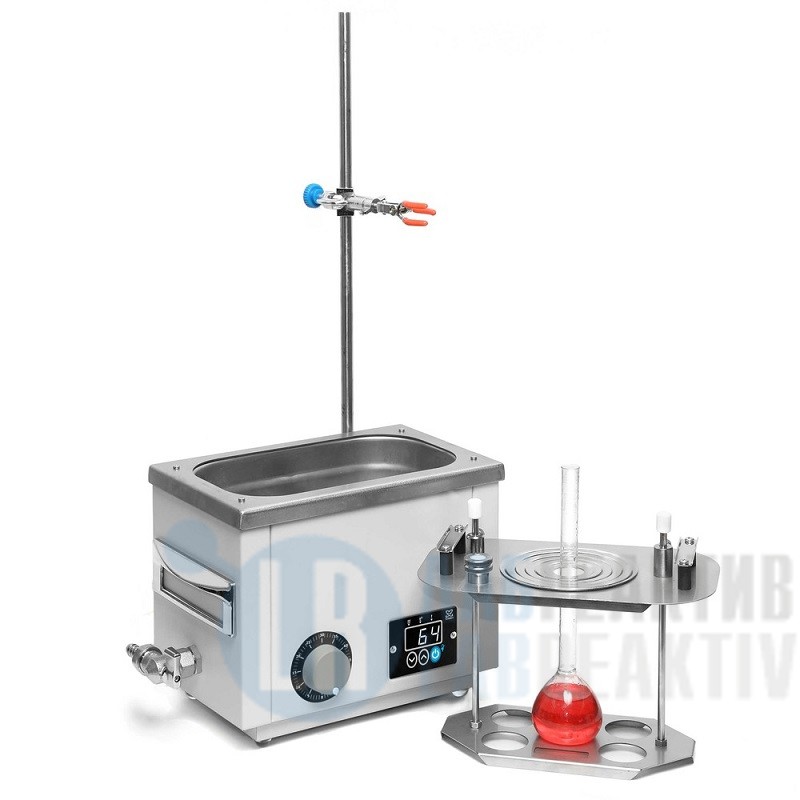 Универсальная баня ЛБ11‑Ш оснащена легко извлекаемой корзиной с подвижным дном для размещения лабораторной посуды различного размера, стальными концентрическими кольцами для ее уплотнения, штативом и лапкой с зажимом.