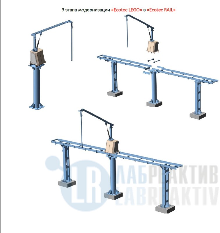 Автоматический пробоотборник «ECOTEC LEGO» устанавливается на одной колонне и может быть модернизирован в дальнейшем до уровня «ECOTEC RAIL» (пробоотборник на рельсе). Если в технологическом процессе работы лаборатории возникнет необходимость в быстром отборе проб из автотранспорта с длинным кузовом или с прицепом всегда есть возможность провести модернизацию пробоотборника «ECOTEC LEGO». При модернизации будут установлены две дополнительные опоры, рельса и оборудование перемещения каретки агрегатного блока по рельсе.
