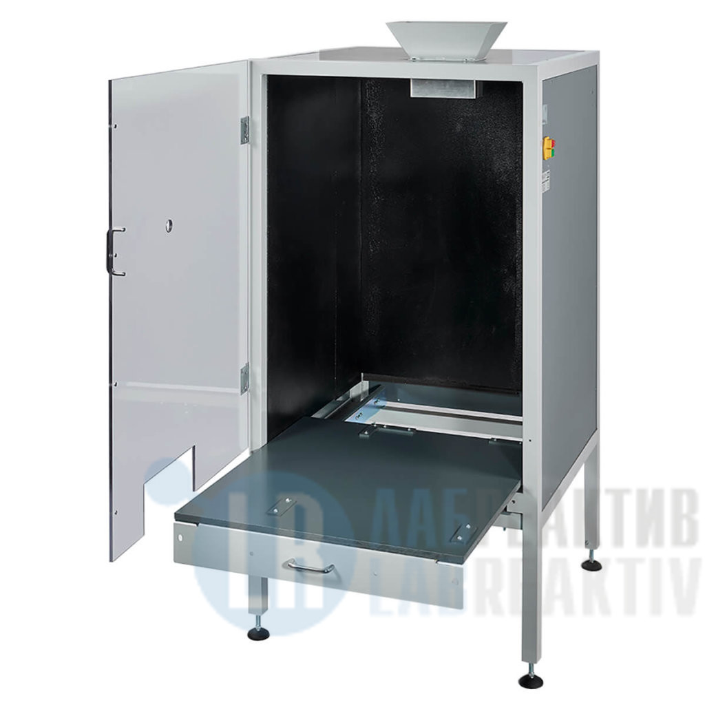 Защитная камера — это шкаф с круговой пенополиуретановой изоляцией, акриловыми стеклянными дверцами с отверстиями для выдвижного ящика, загрузочной воронкой и внешним выключателем управления. Очиститель проб SLN 3 устанавливается на выдвижной сверхпрочный механизм и поэтому может быть быстро выдвинут для регулярной очистки. Защитная камера прикручивается к полу или стене для защиты от опрокидывания.